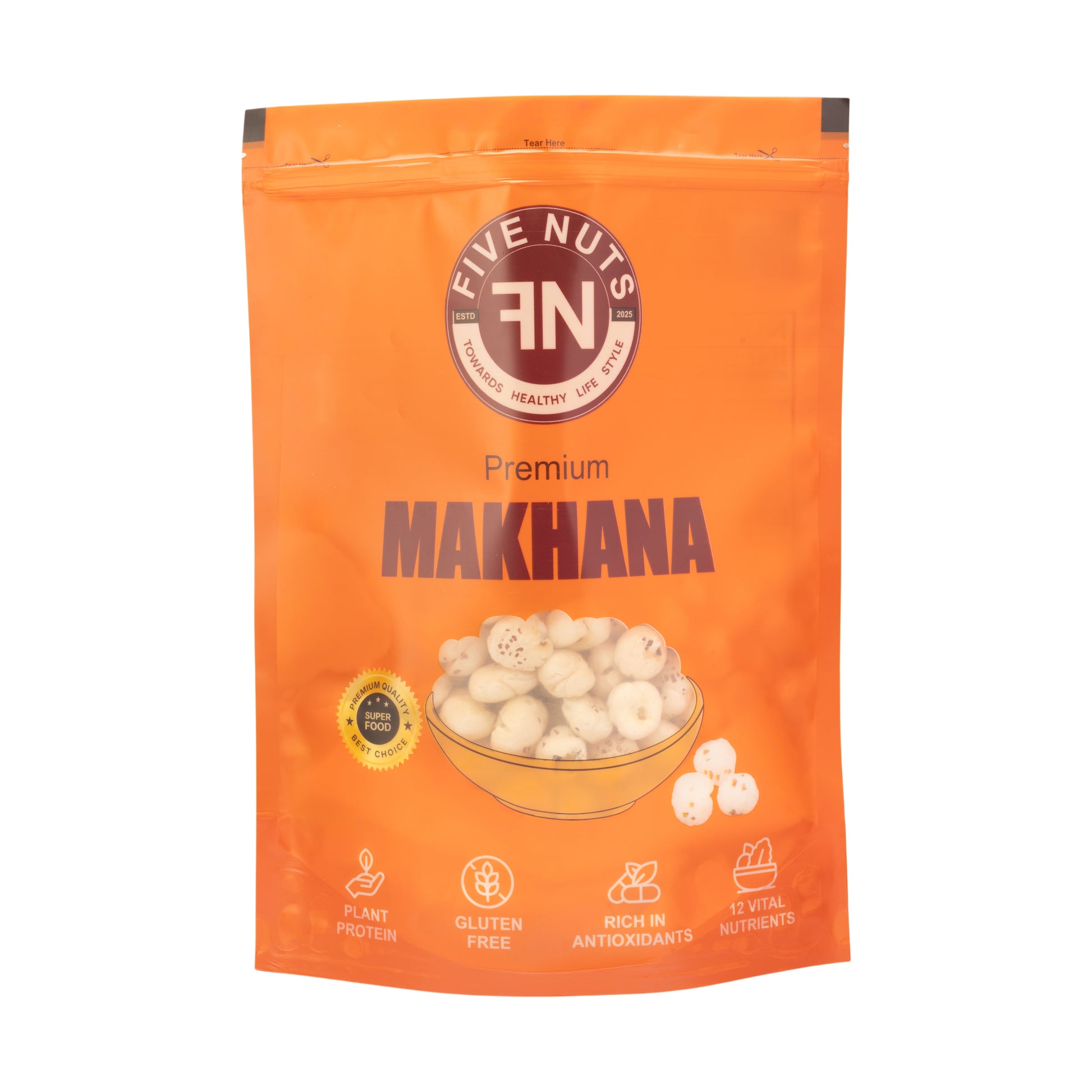 Discover the elegance of our Premium Makhana, featuring a unique blend of Grade 4+ and Grade 5+ foxnuts. This assortment offers varied bite sizes, delivering a rich and diverse texture that appeals to connoisseurs of fine snacking. Made from 100% natural foxnuts, it promises a sophisticated taste experience with every handful.